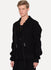 Wool jacket in black from Croatian designer Damir Doma, now based out of Italy, adds a soft heavily fulled black dyed cloth blended of 75% virgin wool and 25% nylon shell with raw edges throughout. The bomber jacket is constructed with a washed chambray turn out lapel collar and hem, classic raglan shoulder. Closed with a fine zip, rib knit sleeve cuffs and hem, welt pockets to front, and finished with side entry chest pockets with signature drawstrings. Made in Italy.