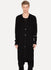 Long cardigan knit sweater from Ann Demeulemeester in black ribbed 90% cotton 10% cashmere with front button closure, off-white stitching at sleeves, I Am Red With Love print to the back. Made in Belgium.