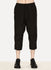 Cropped trousers in Black from Individual Sentiments in a light wrinkled and washed linen cloth with full pinstripe cotton lining, low crotch, elasticized drawstring waist, vertical side pockets, shaped articulated knees. Made in Japan.