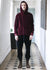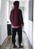 Unisex hoodie in Bordeaux from Individual Sentiments crafted from turpan velvet with pinstripe cotton lining, asymmetrical front zip closure. Made in Japan.